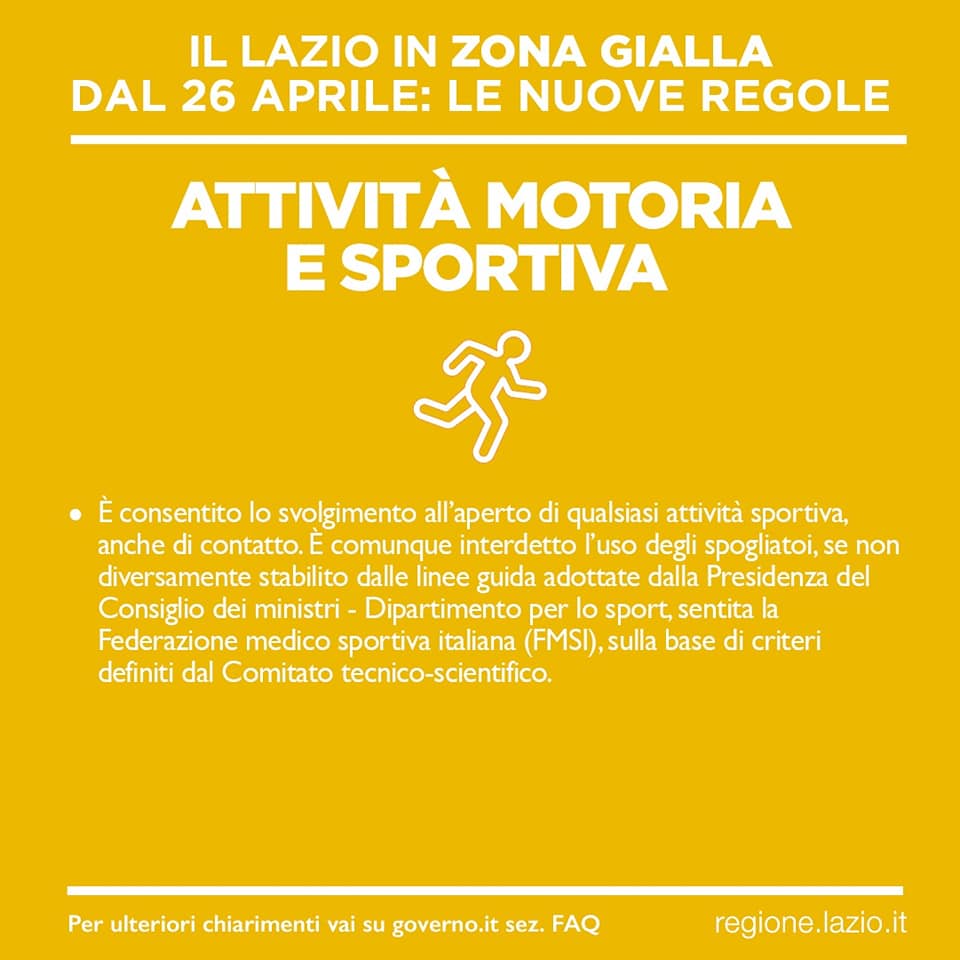 Dal 26 aprile 2021, in zona gialla, nel rispetto delle linee guida vigenti, è consentito lo svolgimento all’aperto di qualsiasi attività sportiva anche di squadra e di contatto. Inoltre, dal 15 maggio 2021, sempre in zona gialla, sono consentite le attività delle piscine all’aperto e, dal 1° giugno, quelle delle palestre" si legge nella nota di Palazzo Chigi diffusa al termine del Cdm.