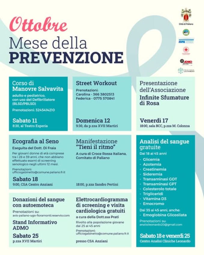 Durante tutto il mese di ottobre, il Comune di Paliano mette a disposizione tanti servizi sanitari gratuiti tra cui: esami, analisi del sangue, corsi di primo soccorso e momenti di divulgazione.