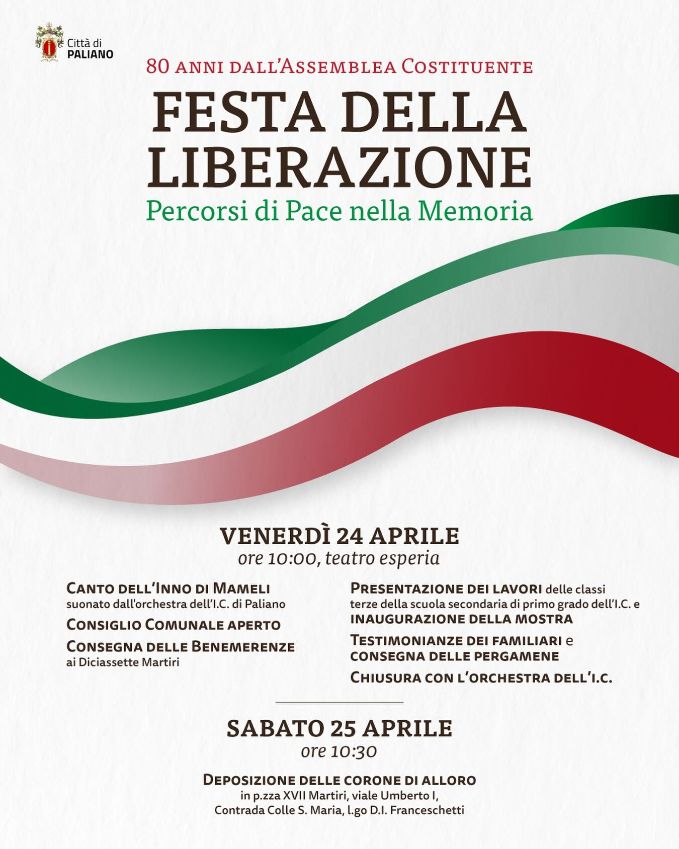 In occasione degli 80 anni dall’Assemblea Costituente, vi invitiamo alle celebrazioni per l’Anniversario della Liberazione dall’occupazione nazifascista, il 24 e 25 aprile, un percorso di pace e memoria.
