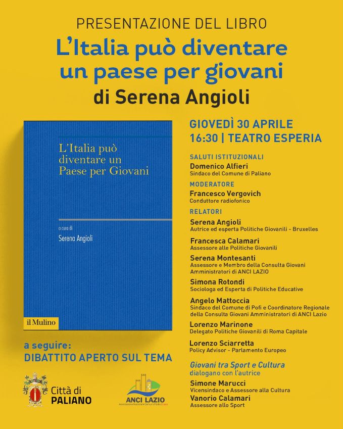 Verrà presentato il libro “L’Italia può diventare un paese per giovani” di Serena Angioli, un’approfondita indagine sulle politiche europee dedicate alle nuove generazioni e sul loro recepimento in Italia. Il volume mette in luce delle criticità, ma anche esperienze virtuose e proposte concrete per costruire un Paese più attento alla valorizzazione del proprio capitale umano costituito dai giovani e al loro protagonismo.