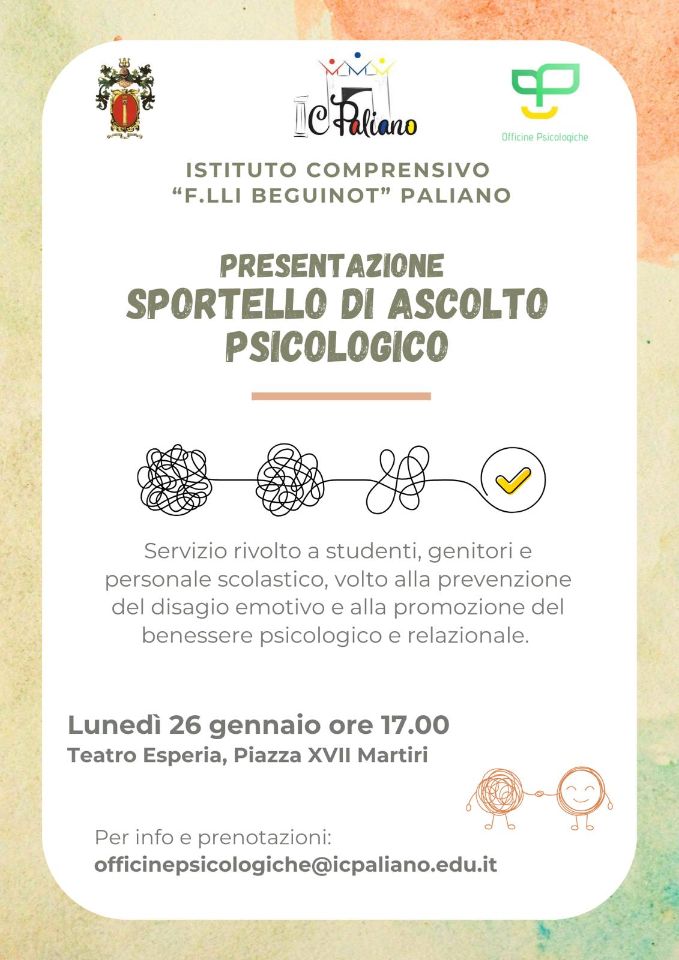 Lunedì 26 gennaio, alle ore 17,00 presso il teatro Esperia, sarà presentato lo Sportello di Ascolto Psicologico, servizio sostenuto e finanziato dall’Amministrazione Comunale che sarà attivato presso l’Istituto Comprensivo di Paliano.