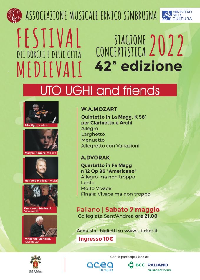 Il grande violinista Uto Ughi terrà un concerto a Paliano il 7 maggio, ore 21.00, nella Collegiata di S.Andrea nell'ambito del Festival dei Borghi e delle Città Medievali, promosso dall’ass. Ernico-Simbruina, giunto quest’anno alla 42ma edizione.